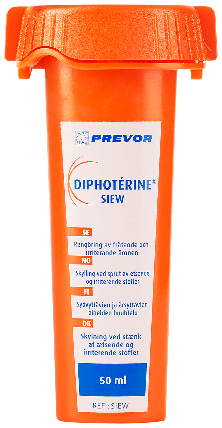 Diphoterin -øyedusj nøytraliserer og skyller bort kjemikaliesprut fra øyet. Diphoterine er en sterilisert skyllevæske som avbryter og uskadeliggjør angrep fra aggressive kjemikalier, både fra alkalier (lut) og syrer. Skulle syren inneholde fluor, skal Hexafluorine anvendes i stedet. I motsetning til vann har Diphoterin evnen til å fortynne og nøytralisere. For å oppnå ønsket effekt med vann kreves det kontinuerlig skylling over lang tid, noe som øker risikoen for vedvarende skader.Bruksområde: øynene (kan brukes på hele kroppen)Kun for engangsbrukHoldbar i 2 år (fra produksjonsdato)Mest effektiv ved bruk over 10 sek.Diphoterin er fargekodet med orangeSkal oppbevares lett tilgjengelig, for umiddelbar brukInnhold:Flaske med 50 ml. Diphoterin.Det følger med et enklere nylonhylster.