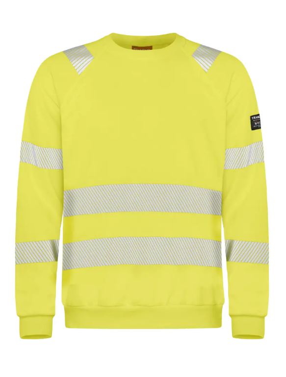 Inherent flammehemmende collegegenser i synlighet med rund hals. PFAS-fri tekstil der 50% av bomullen er resirkulert.
