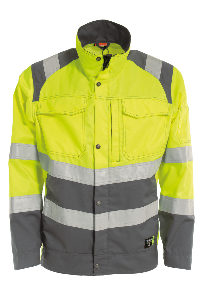 Jakke med høy synbarhet med 9028 fleecefôr. Glidelås med trykknapper i front. Forlenget bakparti. Brystlommer med klaff. D-ring under høyre brystlommeklaff. Vertikal lomme med glidelås. Armlomme. Stikklommer. Justerbar midje og mansjett. To innerlommer. *Plagg i farge 93 oppfyller RIS-3279-TOM.