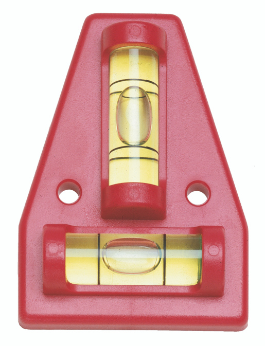 Vater i rødt, slagfast plast med to vinkelrette libeller. Er egnet om du skal kontrollere hellningen på to horisontale dimensjoner samtidig.