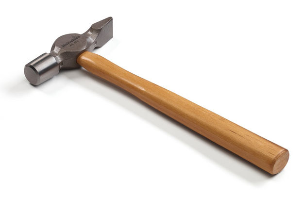 Sandblåst og klarlakkert smidd hammer, med herdede slagflater og lang penn. Treskaft av hickory.