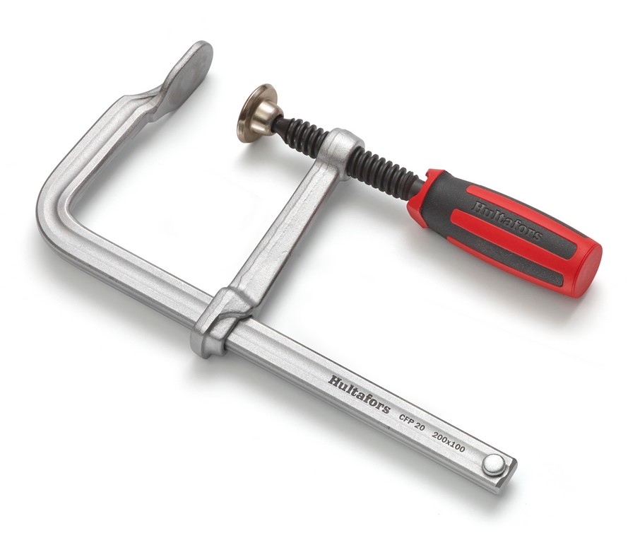 Helsmidd, profilert og glansforzinket skinne av stål. Pivothåndtak for økt kraft når en skal stramme til eller løsne. Smidig fast kjeve for økt tilgang på trange områder. Kraftig flatgjenget, svart fosfatert skrue med klueleddet trykkbrikke.