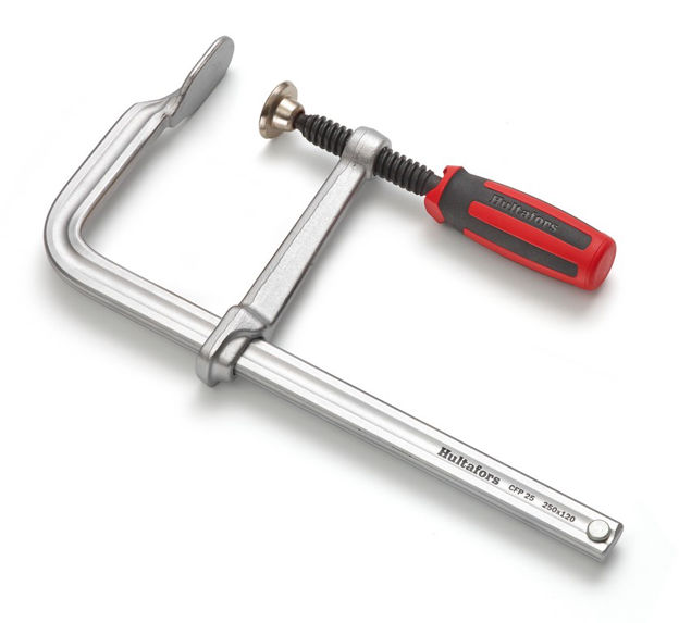 Helsmidd, profilert og glansforzinket skinne av stål. Pivothåndtak for økt kraft når en skal stramme til eller løsne. Smidig fast kjeve for økt tilgang på trange områder. Kraftig flatgjenget, svart fosfatert skrue med klueleddet trykkbrikke.