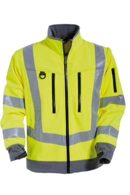 Vind- og vannavvisende softshelljakke i synbarhet med myk innside. Glidelås i front. Vertikale brystlommer med glidelås og D-ring. Stikklommer. Innvendig mobillomme. Armlomme med glidelås. XS-4XL 92 gul/grå, 93 oransje/marine, 94 gul/marine