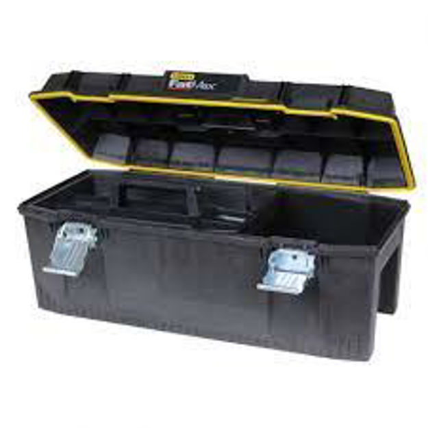 "Vanntett Stanley FatMax 28"" proff verktøykoffert til oppbevaring av større verkøty. Robust konstruksjon, integrert sagegrop, metallhengsler med låsehull og innvendig brett for oppbevaring av mindre verktøy og tilbehør."