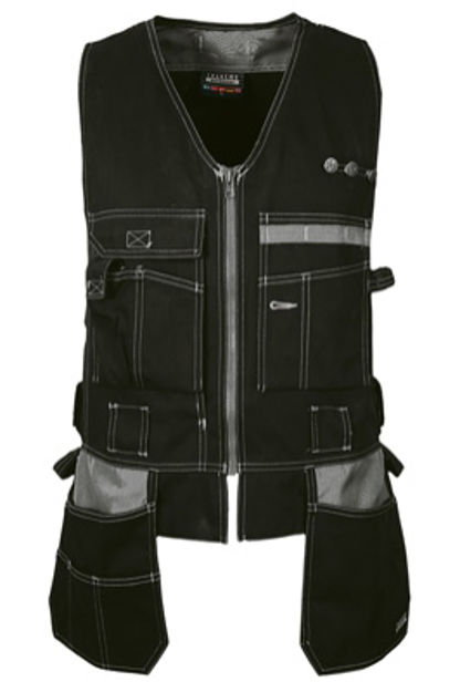 Glidelås i front. Høyre brystlomme med mobil og pennelomme. Venstre brystlomme men pennebånd. Fire hengelommer med HTPA forsterkning. Hammerholder. Verktøyholder i midjen for ekstra tilbehør.